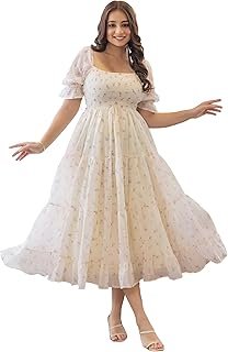 | Dress for Women | Midi Length | Flared Hem | Puff Sleeve | Square Neck | Smocked Bodice
