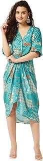 HomeWomen Top Women’s Green Polyester Midi Dress | Abstract Print Asymmetric Hem with V-Neck & Half Sleeves | Stylish Summer Beach Dress for Women | Perfect for Casual, Festive, Party & Holiday Outfits