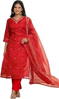 HomeWomen Ethnic Sets Women’s Kota Doria Straight Bandhej Printed Kurta with Pant and Dupatta