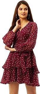 Women’s Stylish Polka Dot Printed V Neck Mini Skater Dress || Women Full Sleeve Sleeve Georgette Casual Short Dress || Womens Long Puff Sleeve Fit and Flare Dresses